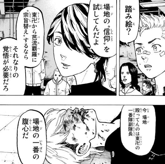 芭流覇羅のアジトに着くといきなり場地が人を殴っている場面に遭遇します。しかも殴っている相手は壱番隊副隊長で場地の一番の腹心だった人間です。一番の腹心だった人間を殴り踏み絵を行うことで、場地が東卍のスパイでない事を証明します。