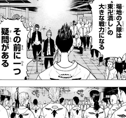 芭流覇羅の幹部・半間は、それでも場地を東卍のスパイではないかと疑います。武道を使って証人喚問を行い、場地が東卍の集会でみんなの前で芭流覇羅に行くと宣言したことを確認します。一虎は場地に関しては芭流覇羅に入れるだけの価値はあると断言します。そして東卍を潰し、マイキーを殺すと宣言します。そして最後に一虎も創設メンバーの一員であり、一虎が東卍を憎んでいる理由を語りだします。