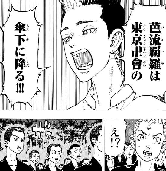 東卍の集会が始まり「血のハロウィン」の総決算として、芭流覇羅の半間までが集会に現れます。芭流覇羅の半間はあいさつで、「血のハロウィン」で負けたことで東卍の参加に下ることを宣言します。と東卍150人の傘下に芭流覇羅300人が加わり、東卍は巨大な組織となります。さらに芭流覇羅300人を東卍の傘下にする話を、マイキーに繋いだのは稀咲と知り、武道はまた東卍が巨悪化してしまうと不安になります。