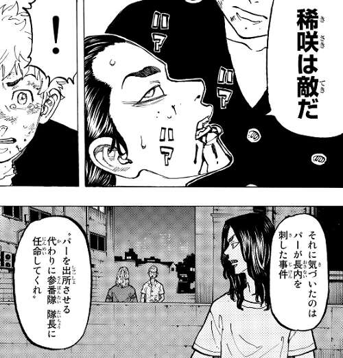 一虎に刺されて殺されるのではなく、場地は自らを刺して自決する事を選びます。なおも、マイキーと一虎は殺し合いを続けようとしますが、武道は林田を出所させる代わりに参番隊 隊長に任命してくれ、と稀咲がマイキーに頼んでいた事を、場地から聞きます。