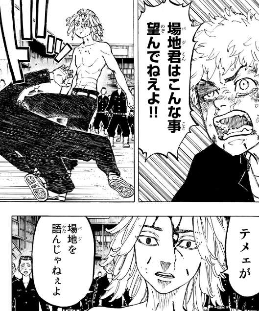 オマエに託す、と場地に言われた武道は、一虎を一方的に殴り続けるマイキーを止めようとマイキーの前に立ちはだかりますが、キレたマイキーに殴られてしまいます。それでもマイキーの前に立ちはだかり、場地が死んだのはマイキーと一虎、二人の為だった事を大声で叫び何とかマイキーを止めようとします。