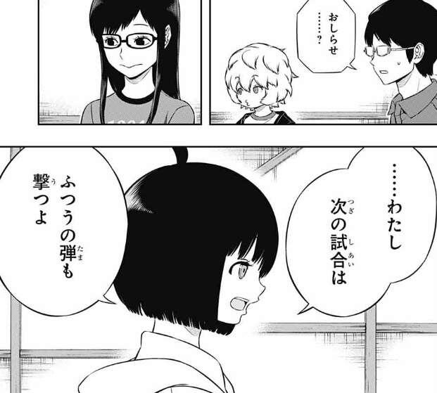 ヒュースの話を聞いて空閑は、雨取が守ってヒュースが撃つ作戦がかなりよさそうと言いますが、陽太郎から突然雨取からお知らせがあると皆へ発表します。雨取は次の試合、ふつうの弾も撃つと言い、自分自身も人を撃つと空閑や三雲に話します。