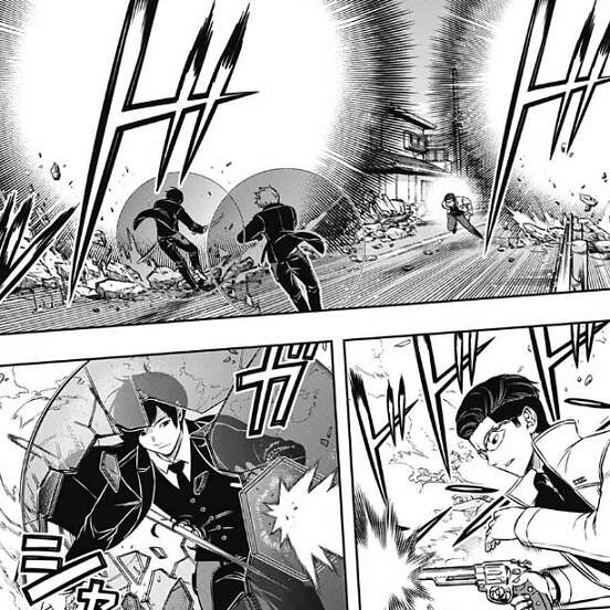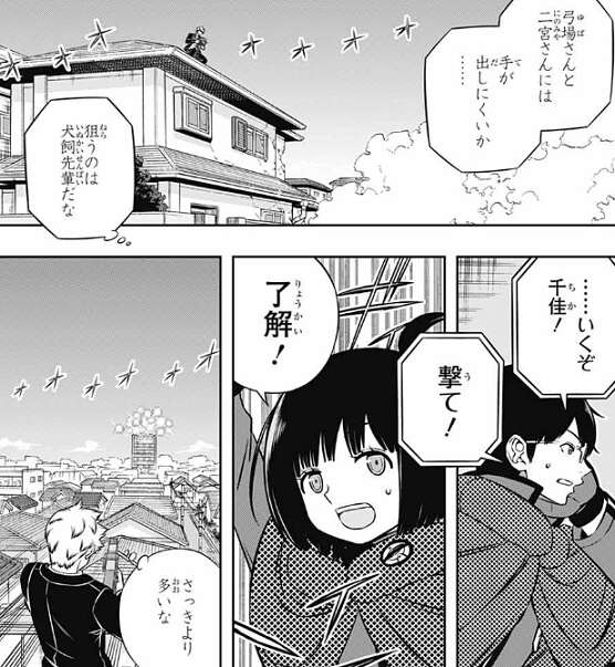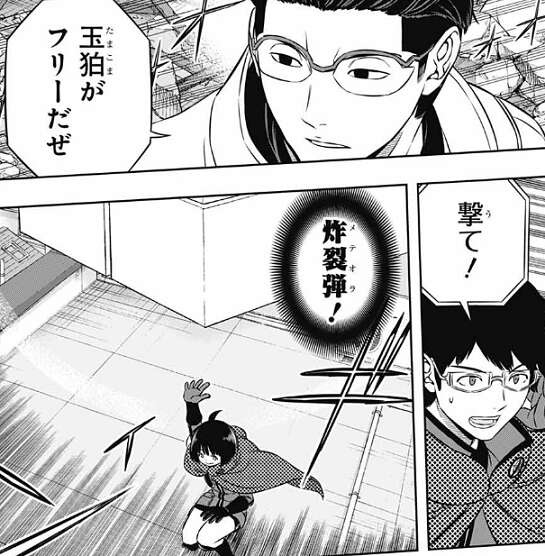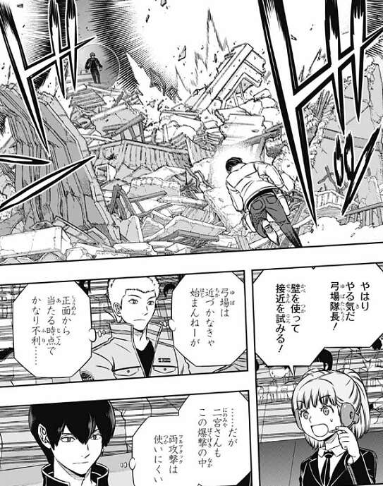 二宮は強化追尾弾(ホーネット)で迎撃し爆撃を何とか防ぐ二宮隊、そしてその隙に弓場が辻を狙撃し狙います。
