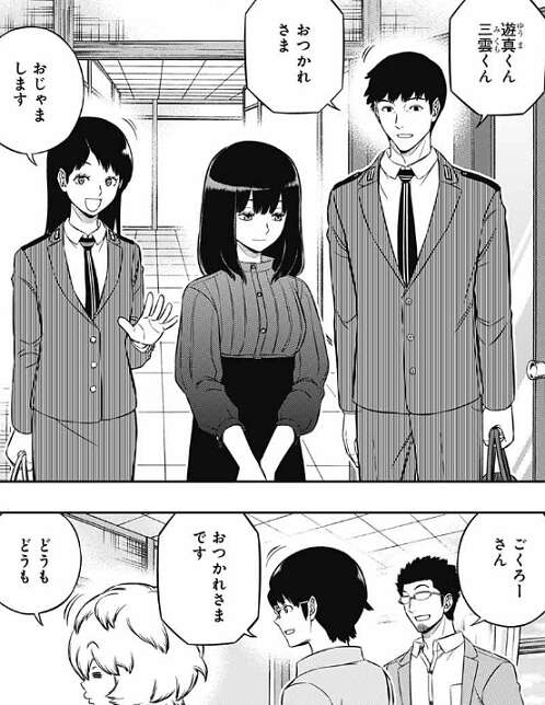 さらに自動車から知らない女性が一人、降りてきます。三雲と空閑、林藤支部長の三人は、忍田本部長と本部長補佐の沢村と女性の三人を、玉狛支部で迎えます。