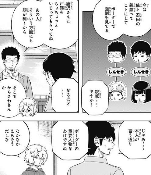 瑠花は大人しくしているように陽太郎を怒り、瑠花と陽太郎は別の部屋に行ってしまいます。三雲は林藤支部長に事情を聞くと、瑠花と陽太郎の両親はネイバー絡みで亡くなっていてその遺産を瑠花が引き継いでいるそうです。そして瑠花は忍田本部長、陽太郎は林藤支部長の親戚という事にして、現在はボーダーで面倒を見ているそうです。