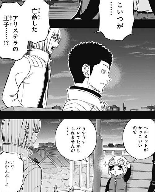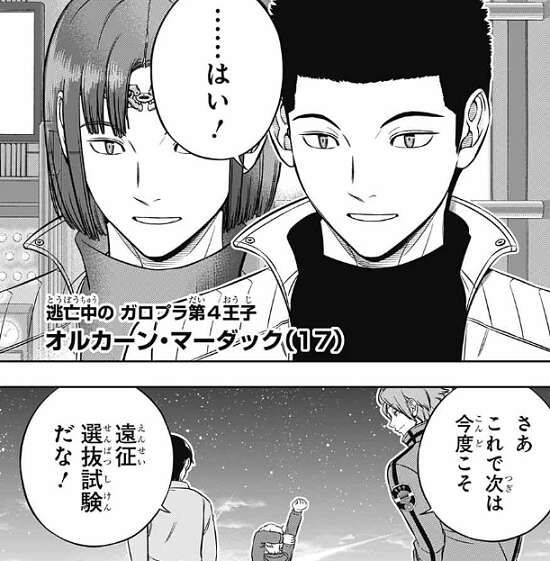 ここで場面が変わり、ラタがガロプラの他のメンバーに、『ボーダー』玉狛支部と同盟を組む事になった事を報告しています。私の考えに付き合わせてすみません、とラタが言うと、ガロプラのことはおまえが決めればいい、俺たちはそれに従うとガトリンは言います。ここでラタの名前は偽名で、逃亡中のガロプラ第4王子、オルカーン・マーダックだと明かされます。さらに場面は変わり空閑達の帰宅の場面になり、次は今度こそ遠征選抜試験だな!と空閑が喋っています