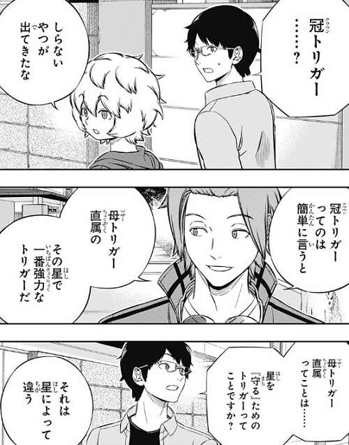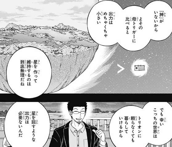 母(マザー)トリガーを動かしているのはアリステラの王女 瑠花で、そこから生まれるトリオンをコンピューターでコントロールして、ボーダーはあれこれやっていると、林藤支部長はラタに伝えます。ラタは、王女が新しい「神」になったということか?と質問すると、瑠花はトリガーを動かしているだけで「神」にはなっていないと答えます。「神」がいないから、他の母(マザー)トリガーに比べるとパワーはめちゃくちゃ小さいが、こっちの世界はトリオンに頼らなくても暮らしていけるから、星に回すようなパワーは必要ないようです。