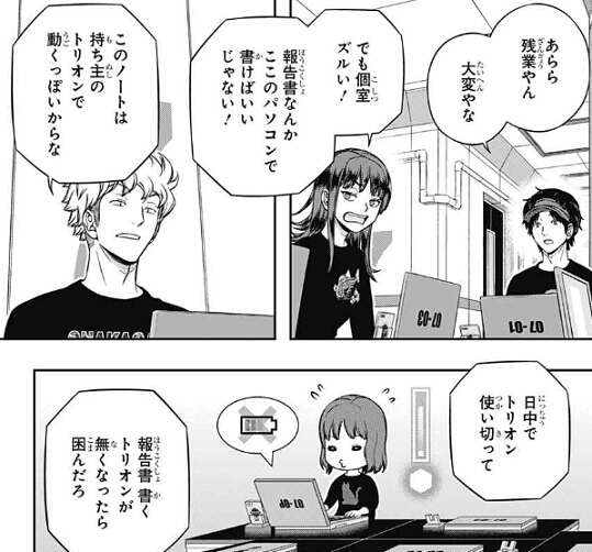 さらに規定を読み進めると、オペレーターにはオペ用の部屋があり、そこで寝泊まりするようです。オペレーターは夜9時になったらオペ用の部屋に引っ込んで、そこのPCでその日の報告書を作成すること、となっているようです。香取が個室はズルい!と、言い報告書はここのパソコンを使えばいいと言います。しかし諏訪は、ここのノートパソコンは持ち主のトリオンで動くっぽいから、日中でトリオン使い切って報告書を書くトリオンが無くなったら困るだろ、と言い、オペレーター用の部屋があるのは仕方ないと擁護します。