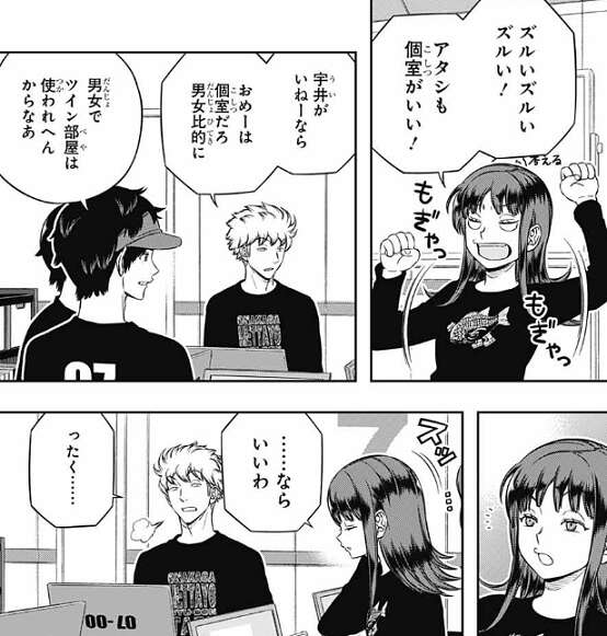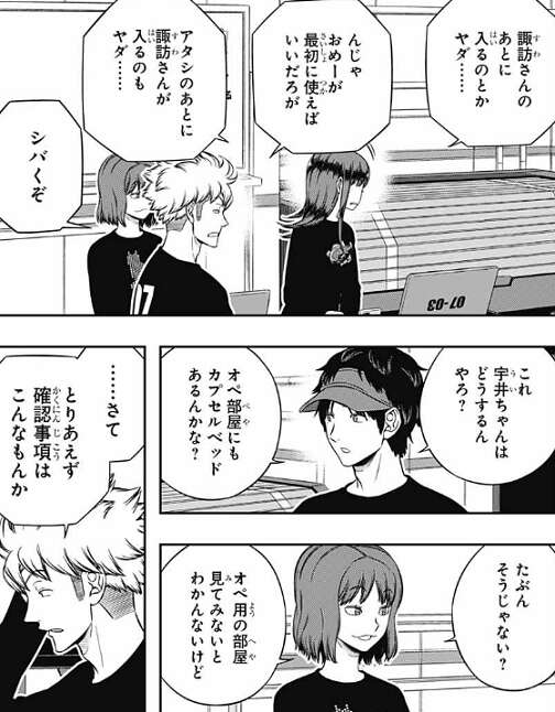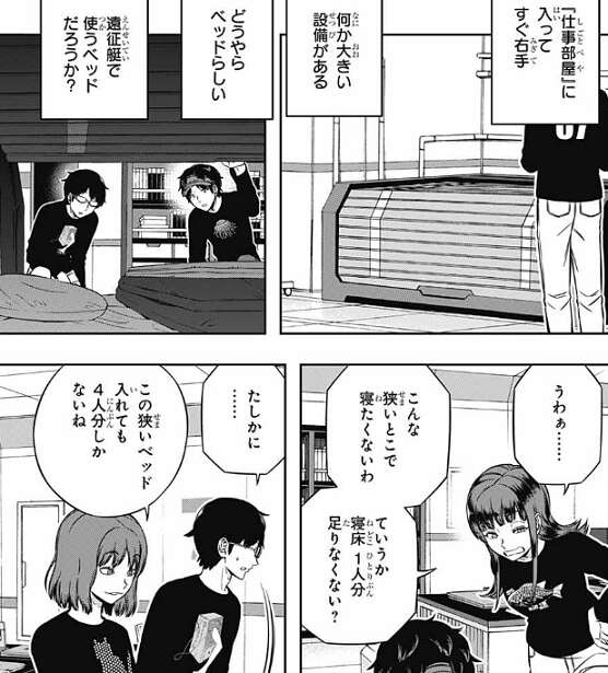 諏訪が、おめーが最初に使えばいいだろが、と言いますが、アタシのあとに諏訪さんが入るのもヤダ……、とワガママを言い、諏訪からシバくぞ、と突っ込みが入ります。結局初日は、カプセルベッドを隠岐、ツイン部屋を諏訪と三雲、シングル部屋を香取、オペ部屋を宇井が固定で使うことで落ち着きます。