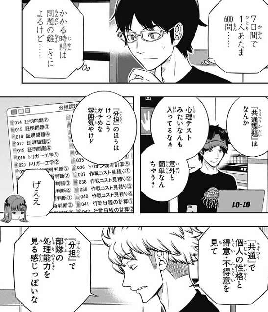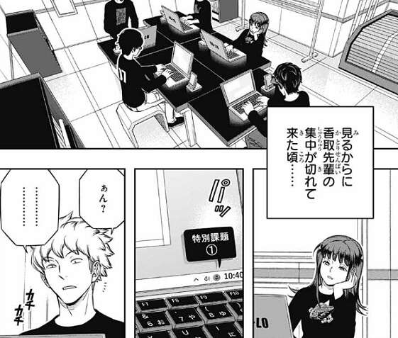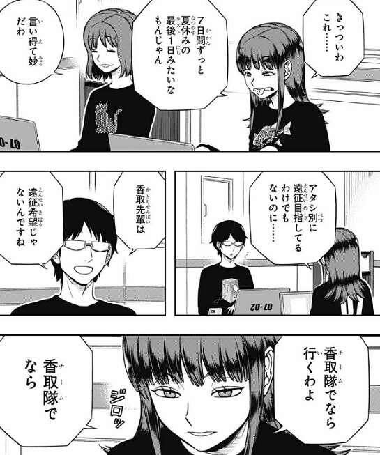 共通課題と分担課題の多さに香取が、7日間ずっと夏休みのラスト1日みたいなもんじゃん、と文句を言います。別に遠征目指していないし、と香取が言うと、遠征希望じゃないんですね、と三雲が笑顔で香取に質問します。すると、チームでなら行くわよ、チームでなら、とジロッと三雲を睨みながら香取は答えます。チームで選ばれる権利があるのは、B級ではランク戦を勝ち抜いた二宮隊と玉狛だけなので、チームで選ばれる権利のない香取は一人で行く気になんない、と言います。しかし、お前は選ばれないと諏訪から突っ込みが入り、今度は可能性あるでしょ、と香取は遠征に行きたいような言い方をします。