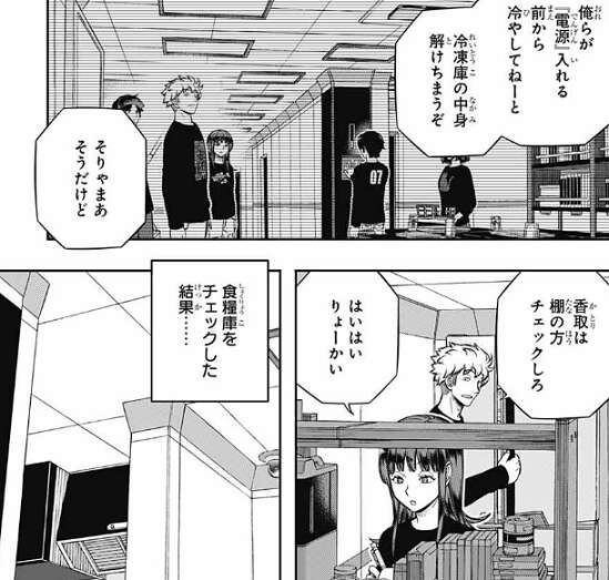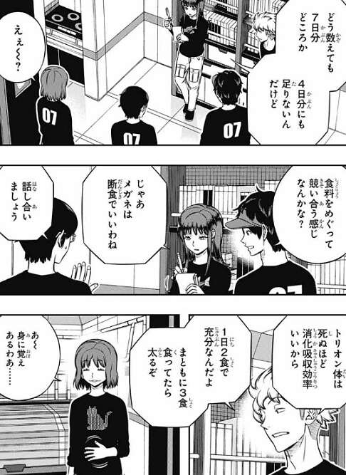 香取が棚の食料をチェックした結果、7日分の食料どころか4日分にも足りない事が判明します。三雲は断食でいいわね、と香取に勝手に言われて、話し合いましょう、と三雲が異議を唱えます。そこで諏訪が、トリオン体は死ぬほど消化吸収効率いいから、1日2食で充分なんだよ、まともに3色食ったら太るぞ、と言います。宇井もそれに同意しますが、1日2食の計算でも5・6日分しかもちません。