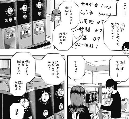 さらに香取のメモには、『?』がついている部分があり、小麦粉、砂糖、塩の容器は空っぽで、容器にはダイヤルがついています。香取はダイヤルが怪しそうだから、まだ触っていないと言い、回してみれば?と、三雲に言います。三雲は言われるがまま、小麦粉のダイヤルを回すと小麦粉が出てきます。