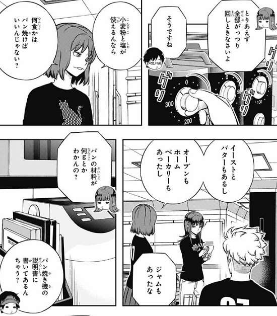 しかし、小麦粉はチョロチョロしか出てこず溜まるまで時間がかかりそうです。香取は、とりあえず全部がっつり回しときなさいよ、と三雲に言い、三雲もそうですね、と全部のダイヤルをがっつりと回します。宇井が、小麦粉と塩が使えるんなら、何食かはパン焼けばいいんじゃない?と、言い、イーストとバター、オーブン、ホームベーカリー、ジャムもあるのでパンを作ることになりそうです。卵と牛乳もキープし、ごはんの方は何とか大丈夫そうです。