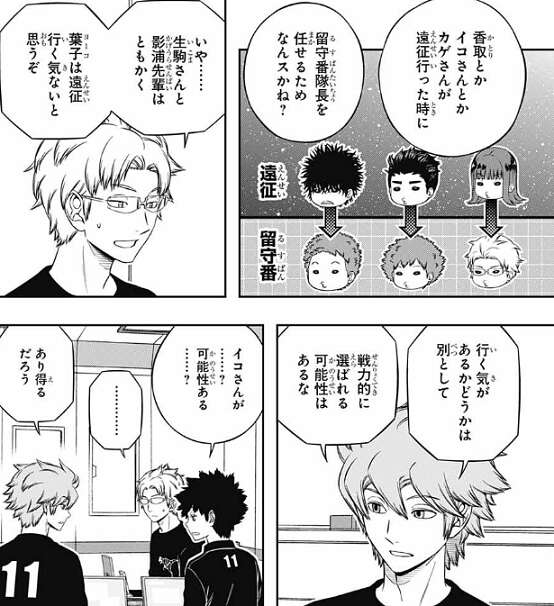 すると諏訪は、歌川、古寺、北添、村上は次の世代の隊長候補としてテストしてんだろうな、といい、二宮、来馬、柿崎、王子は未来の幹部候補としてじゃねーか?と、意見を言います。この先、正隊員が増えていったら、いつまでも本部長だけで回せないだろうから、それを見据えての幹部候補だろうと言います。