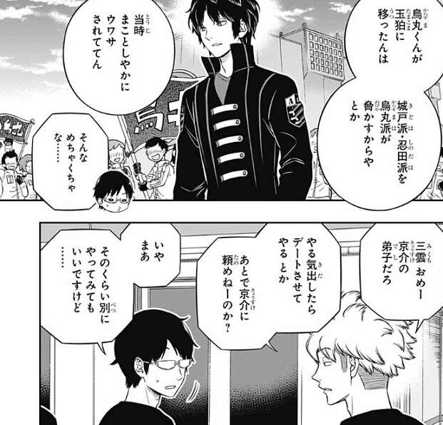 香取は本人も隠す気がないレベルの烏丸のファンガールで、本部には烏丸のファンはかなりいるようです。また烏丸が玉狛に移ったのは、木戸派・忍田派を烏丸派が脅かすからだ、という事が当時、まことしやかにウワサされたようです。そして、三雲 おめー京介の弟子だろ、やる気出したらデートさせてやる、とかあとで京介に頼めねーのか?と、諏訪は三雲に言います。三雲は半信半疑ながら、そのくらい別にやってみてもいいですけど……、と言っていると…。