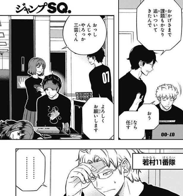 諏訪も、晩メシ当番いけんのか?と、話しかけますが、やはり会話が成立せず、諏訪も会話を諦めます。晩メシ当番は最初、諏訪がやろうとしますが、三雲の課題もかなり追いついてきているという事で、三雲が晩メシ当番を手伝うことになります。一方、若村11番隊の若村は、3日目の順位も最下位という状況に悩んでいました。