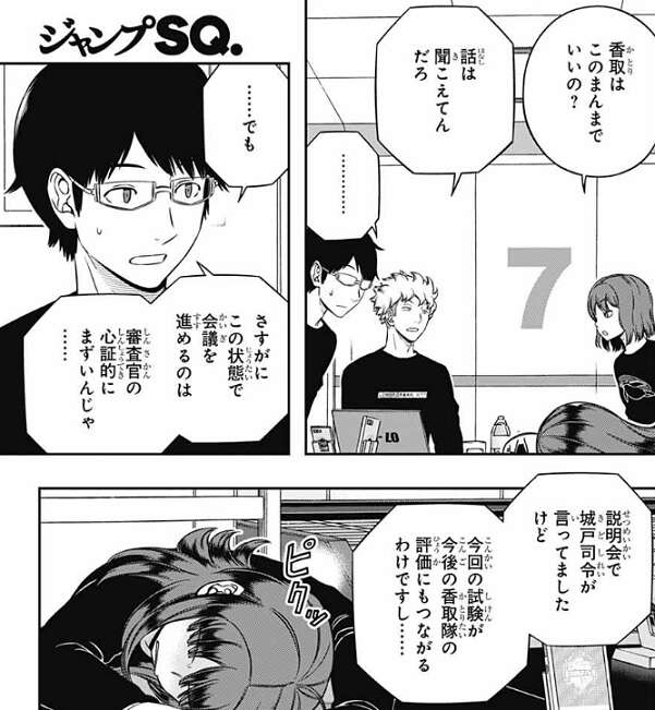 場面は諏訪7番隊に戻りますが、香取は相変わらず不機嫌で会話も成立しない状態で、夕メシも食べていません。諏訪は明日の対策の話し合いを始めようとしますが、宇井が香取はこのままでいいの?と、諏訪に話しかけます。諏訪は、話は聞こえてんだろ、と言いますが、さすがにこの状態で会議を進めるのは審査官の心象的にまずい、と三雲が意見します。今回の試験が今後の香取隊の評価にも繋がる、と説明会で木戸が言っていたと三雲が言うと、それを聞いた香取が突然立ち上がります。