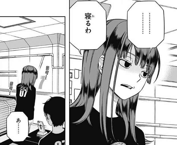 なんか……急にやる気なくなったわ、と言った香取はそのまま机に突っ伏してしまうと、何も返事をしなくなってしまいます。隠岐や宇井が話しかけても無反応で、返事しないとくすぐっちゃうよ~、と宇井が言うと、さすがに香取は反応しますが、言語を喪失してしまっています。香取の様子を見て、不機嫌になると会話を拒否るらしいからな、という諏訪の言葉を三雲は思い出します。