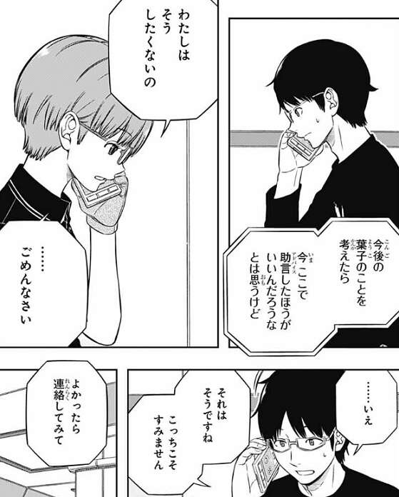 すると、三雲が香取隊の人たちに電話をしてきていいですか?と、諏訪に尋ねます。香取隊の人たちなら三雲達より、香取の事をよく知っているからと三雲は言い、諏訪も同意して電話をかけてくるように言います。しかし、最初に電話をかけた北添4番隊の染井は、この相談に乗ると香取の欠点について話すことになり、本人のいないところでそういう話はしたくない、と三雲の相談を断ります。今後の香取の事を考えたら、今ここでアドバイスした方がいいんだろう、と染井も頭では分かっているようですが、わたしはそうしたくないと言い、三雲に謝って断ります。三雲も染井の考えを尊重して、こっちこそすみません、と三雲も謝ると、香取隊の他の2人ならもっとちゃんとした答えが返ってくると思う、と染井は言いそっちに連絡するように言います。