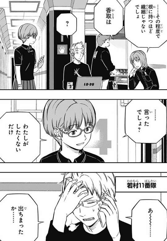 三雲との電話を終えた染井は部屋に戻ってきますが、強化聴覚のサイドエフェクトを持つ菊地原は三雲との電話が聞こえていたようで、……その程度で根に持つほど繊細じゃないでしょ、香取は、と染井にアドバイスします。しかし菊地原の突然のアドバイスにも驚かず、……言ったでしょ?わたしがしたくないだけ、と染井は冷静に答えるだけでした。