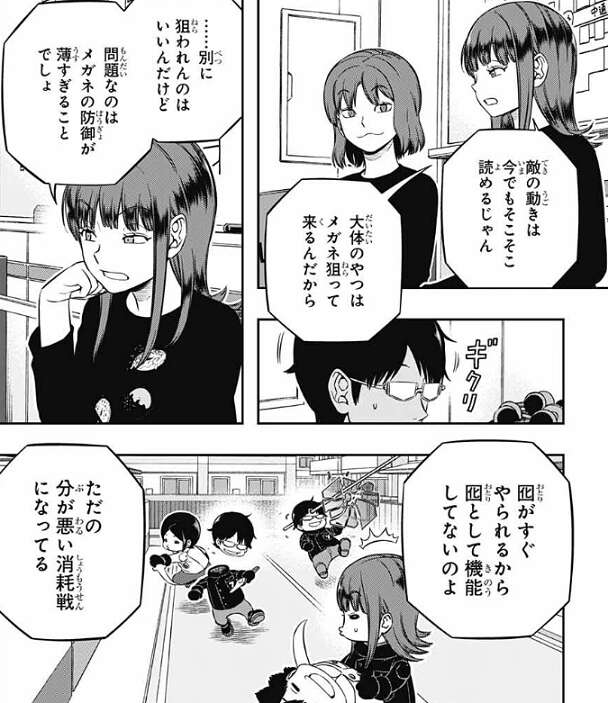 香取は三雲が囮として機能する前にやられるから、分の悪い消耗戦になっている、と意見を出します。すると、三雲の防御が上がればなんとかなるかも……?と、宇井が意見を出します。