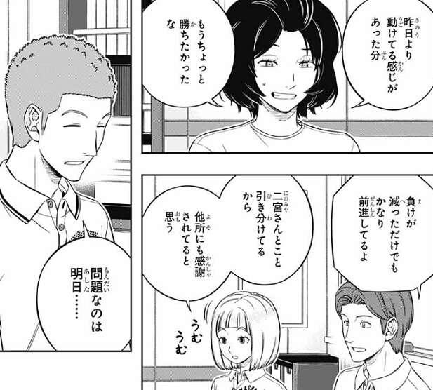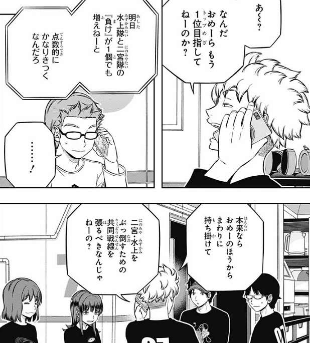 東から、たった1日でこれだけ上がれば大したもんだ、と二宮は話を振られますが、下がるよりはマシですね、と厳しい言葉ながら、二宮からも絵馬は評価されます。さらに、昨日よりはいい動きだった、明日もこの調子で頼むぞ、と雨取も二宮から褒められ、雨取は嬉しそうに返事をします。もしかしたら二宮にとってはこの言い方でも十分、絵馬と雨取を褒めているのかもしれません、二宮は表情が乏しいのでいまいち分かりづらいですが…。