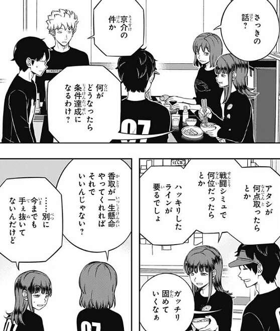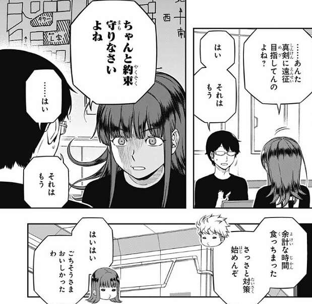 そして、香取は三雲に真剣に遠征選抜を目指しているか確認し、三雲が真剣だと分かると、ちゃんと約束守りなさいよね、と香取は怖い顔で三雲に圧をかけてきます。ここでデートの話は終わり、諏訪7番隊は戦闘シミュ3日目に向けて、対策を始めます。