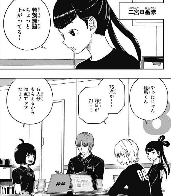 二宮8番隊は、絵馬が担当した特別課題がちょっと上がっている、と加賀美から褒められていますが、71点から75点に少しだけ上がっただけなので、絵馬本人は不満そうです。雨取は5人分もらえるから20点アップだよ!と、不満そうな絵馬をさらに褒めます。