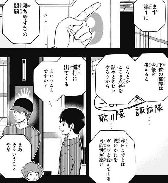 こうして戦闘シミュ前の説明が終わり場面は運営本部デスクへ戻り、水上9番隊の成績は10位で2勝7敗1引き分け、440点でした。水上の予告した通り2勝していますが、真木辺りが、詭弁だね、と言いそうな内容だ、と鬼怒田がつぶやいています。しかし、水上の戦略は上位4チームに絞った対策だけでなく、前の日に下位の何チームかに宛てて上位チームのユニット情報を流していたそうです。隊員に無茶な要求をする一方で、別のルートからも手を打っていた、と城戸は評価しているようです。こういう人材がいると楽なのではないのかね?と、城戸が忍田に質問しますが、時と場合による、渋い顔で答えます。どうやら林藤の事が頭をよぎったようです。