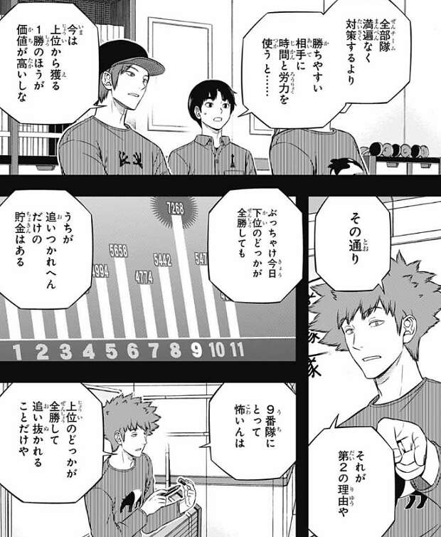 また、今は上位から獲る1勝の方が価値が高い、と荒船が意見を言うと、それが第2の理由だと水上は荒船の意見に付け加えます。下位チームが全勝しても村上9番隊が抜かれないだけの貯金があるが、上位チームのどこかが全勝して追い抜かれる方が怖い、と水上は第2の理由に説明を付け加えます。