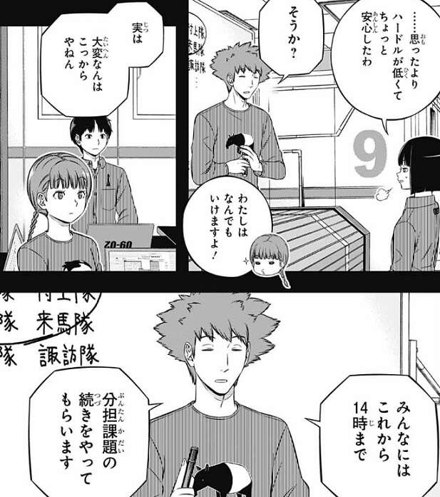 この試験は最終的に分担課題の進み具合で勝負がつくと水上は考えていて、ギリギリまで分担課題をやりつつ、戦闘シミュはピンポイントで対策する、と水上は隊員に説明します。試合直前の1時間だけで4チーム分の対策を仕上げるのでかなりハードルは高く、思った通りハードルが高いと分かり今は難しそうな顔をしますが、水上はこのメンツならいけると思って作戦を立ててる、と隊員に言います。これで間に合わへんかったら、計算ミスったオレの責任や、と水上は言いますが、照屋は、間に合わせてみせますよ!と、自信を見せます。荒船は、プレッシャー掛けんな、とツッコミを入れますが、照屋と同じく自信はありそうです。