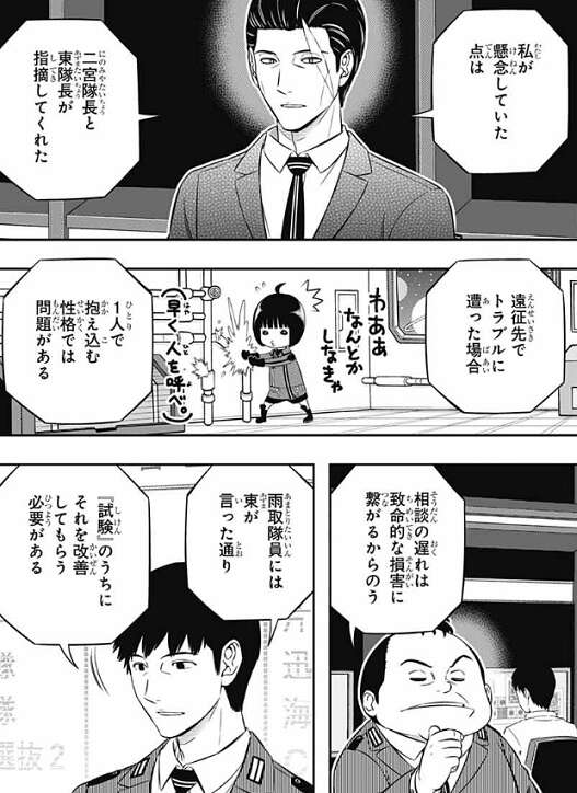 そして二宮8番隊ですが、既に全員試合内容は見ていたようで、それを踏まえて城戸が懸念していたのは二宮と東が指摘していた、雨取の一人で問題を抱え込む性格です。遠征先でトラブルに逢った時に、相談が遅れては致命的な損害に繋がる、と鬼怒田が言い、試験のうちに一人で抱え込む性格を改善する必要があり、そこを確認したかったようです。