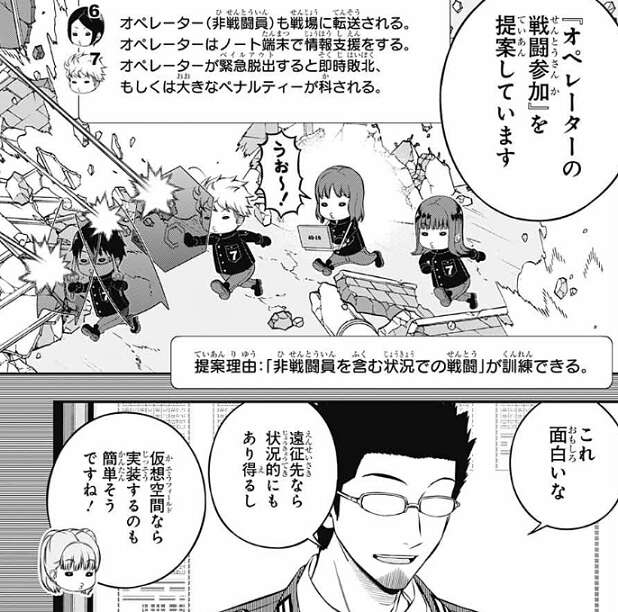 そして、閉鎖環境試験 5日目から始まる特殊戦闘シミュの詳細が明らかになります。専用ソフトを使って、オリジナルのトリオン兵を各隊員1体以上作成し、特殊戦闘シミュで操作しなさい、というものでした。各隊員1体以上作成、という事は何体も作成しても問題ないように見えますが、その辺りは専用ソフトで多分制限が掛けられているのでしょう。他にも特別課題③で新しいアイデアがたくさん出ていたので、他のアイデアも採用されていてもおかしくありません。どんな特殊戦闘シミュになるのか、各チームはどう対応するのか、今後の展開も楽しみです。