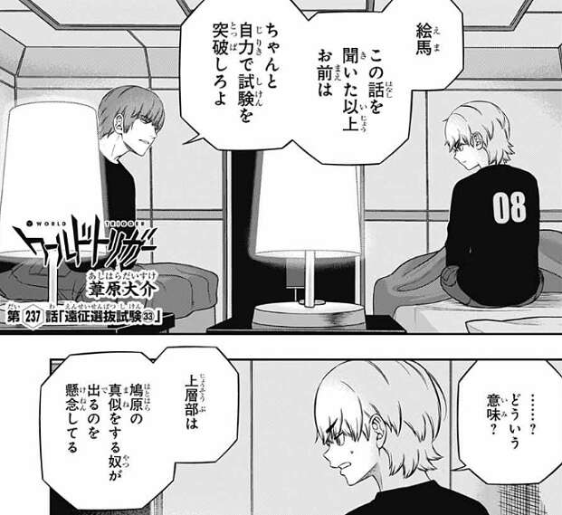 絵馬に鳩原失踪の真相を伝えた二宮は、ちゃんと自力で試験を突破するように念を押します。上層部は鳩原の真似をして、ネイバーフッドに密航する人間が出ないか懸念しています。そんな真似をしないように二宮は念を押しますが、絵馬はそんなことするわけないと言おうとします。