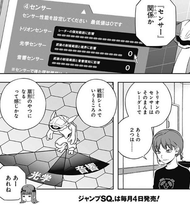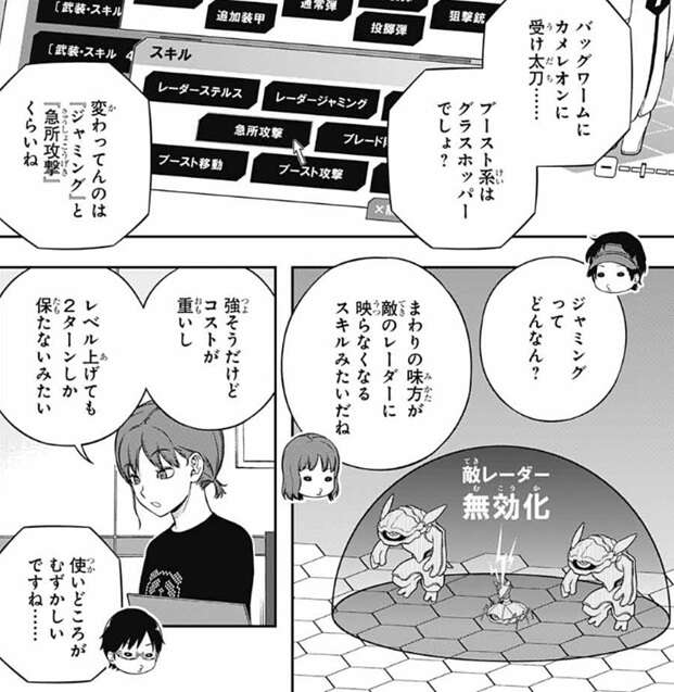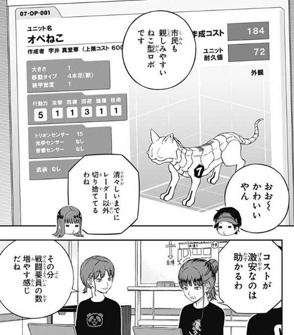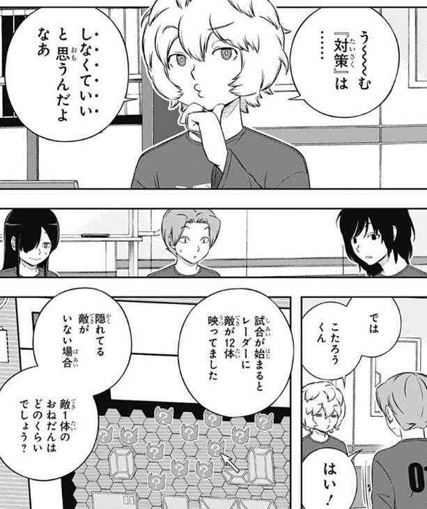 さらに漆間に言われて、空閑は対策の案も出します。空閑は対策に関して、しなくていいと思うんだよなあ、と言います。ここで、巴に試合が始まってレーダーに敵が12体映っていた場合の、1体のコストがどれくらいかという問題を出します。単純に考えれば、チームコストが12,000なので、1体1,000ぐらいとなる、と巴は答えます。20体くらい映っていたら?と、空閑に続けて質問されて、その場合は1体600前後、と巴は答えます。しかし漆間が、コストが超安いダミーユニットを混ぜれば、もっと強いユニットも数が出せる可能性を指摘します。