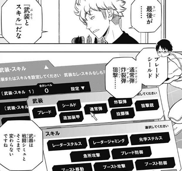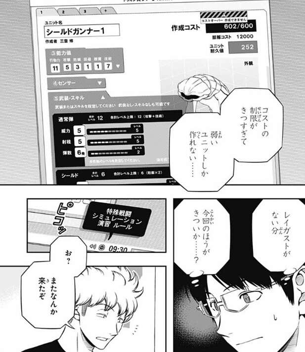 三雲は「シールドガンナー1」というトリオン兵を作ろうとしていますが、コストの制限が厳しく苦戦しています。そこに特殊戦闘シミュレーション演習のルールが到着します。諏訪7番隊はルールのチェックを始めます。