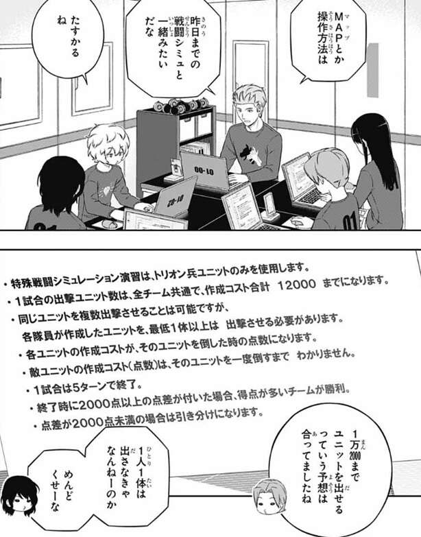 場面は歌川1番隊に移り、歌川1番隊もちょうど特殊シミュのルールを確認していました。MAPや操作方法は昨日までの戦闘シミュと同じですが、特殊シミュで使うユニットはトリオン兵のみです。やはり1試合で出撃できるユニット数は、全チーム共通で作成コスト12,000までになるようです。また、作成コストがそのまま『得点』になるようです。戦闘シミュではユニットが強くても弱くても1体倒すと1点でしたが、特殊シミュでは強いトリオン兵を倒すと、作成コストが高いので得点も高くなります。二宮隊が作った強いトリオン兵は、得点は1,000点以上ありそうです。