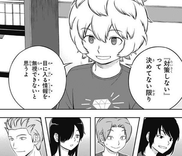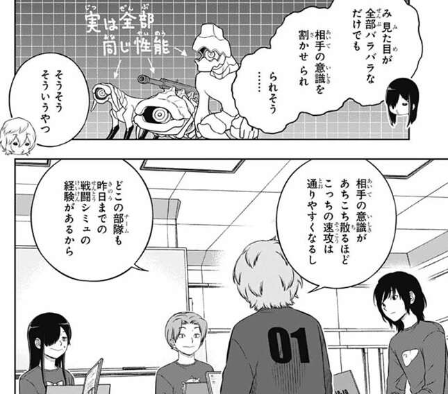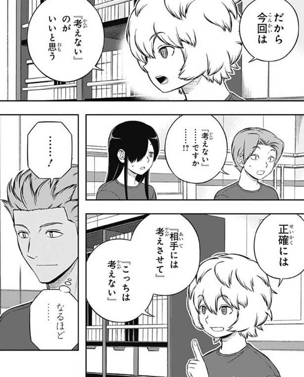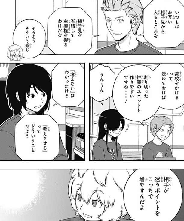 結局、レーダー上の情報だけだとユニットの強さは測りにくい、と歌川は言い、1回ユニットをぶつけるまで何も分からないってことになる、と漆間は言います。空閑は漆間に同意し、今回は『考えない』のがいいと思う、と空閑は意見を言います。正確には『相手には考えさせて』『こっちは考えない』ということだと空閑は言いなおします。