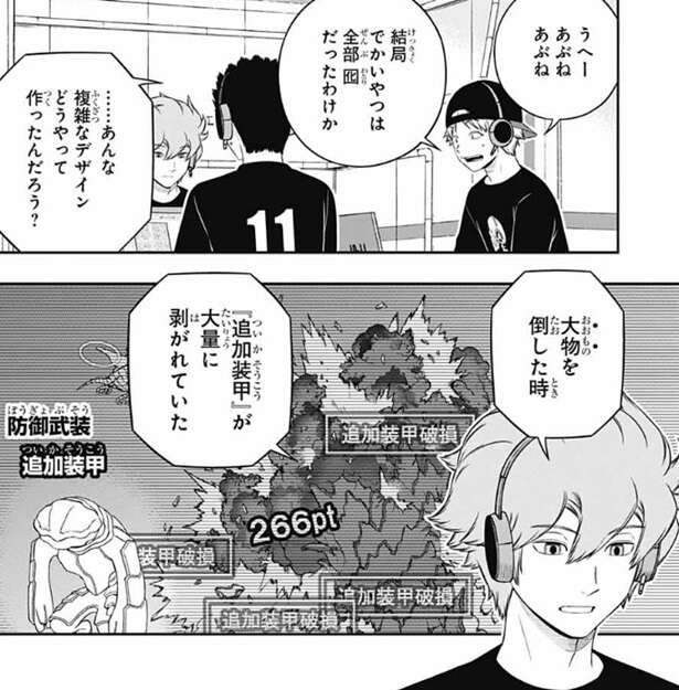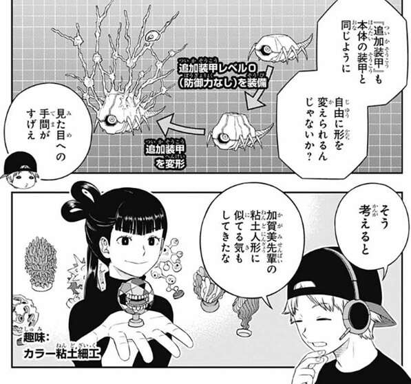 『追加装甲』も本体の装甲と同じように自由に形を変えられるんじゃないか?と、ヒュースは言いますが、見た目への手間がすごいと半崎が驚きます。そして、半崎は加賀美が作った粘土人形に似ているとつぶやきます。加賀美の趣味はカラー粘土細工で、美大への進学も決まっている創作系オペレーターなので、あの独特の見た目のユニットも趣味のカラー粘土細工の技術を生かして、加賀美が作ったものなのでしょう。あの独特の見た目のユニット3体で注意を引き付けて、雨取作の遊真くんで敵ユニットを蹴散らすのが二宮隊の作戦なのでしょうが、ヒュースの爆撃機には遊真くんの攻撃が届かないので、安心して若村隊は行動できたようです。
