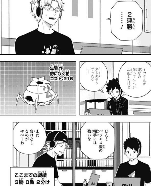 4試合目の柿崎3番隊とは3千点差で勝利、5試合目の王子2番隊とは2千点差ギリギリの点差ですが勝利します。これで2連勝で、負け無しの3勝目です。ちなみに生駒は野に咲く花というユニットを作っていて、前回のう〇この見た目のユニットから変更したようです。細井も生駒が変なユニットを作ってなくて、ほっとしています。バランス型の相手にはヒュースの飛行型はめっぽう強く、これもうヒュースの飛行型だけでいけんじゃね?と、半崎が言いますが、ヒュースは、どうだろうな、と半崎の意見に否定的です。
