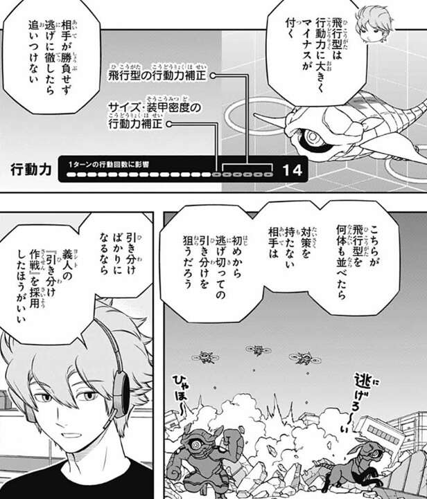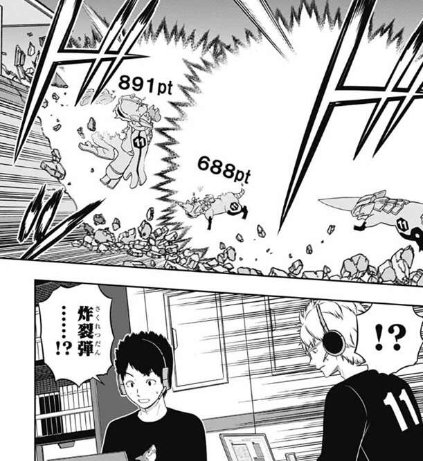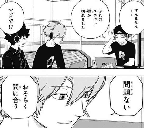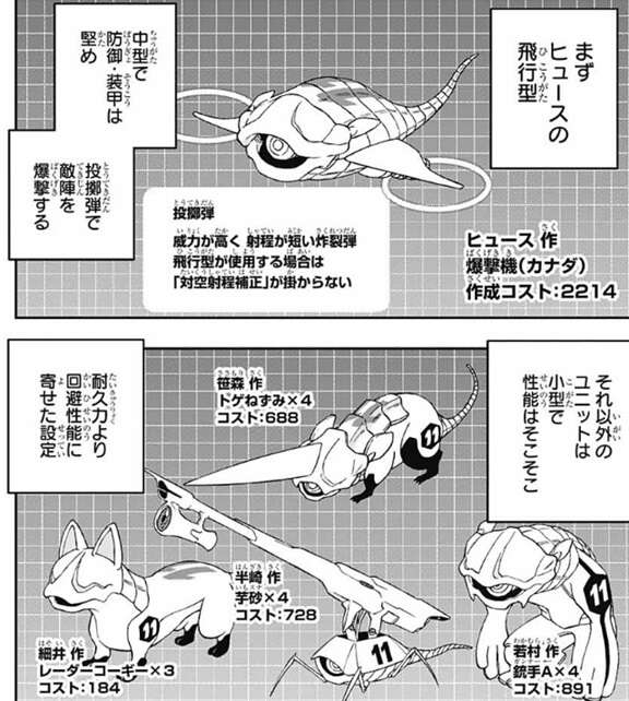 3体すべてが見た目通りヤバい強さなら、それだけでめちゃくちゃコストを食う事になりますが、レーダーに映っている敵は全部で12体だそうです。見た目からしてヤバそうなユニットのコストを仮に3,000とすると、3体の合計コストは9,000となります。第238話でチームコストが12,000と説明があったので、もしこの3体が本当に強いなら12体ものユニットを投入するのは難しい気がします。しかし若村は、3体以外は全部雑魚とか、3体のうち1体だけ超強ぇとかも有り得る、と言い、見た目のヤバそうなユニットを警戒します。そして、ヒュースのユニットならそう簡単にはやられないだろうと若村は予想し、1回爆撃するようにヒュースに指示します。ヒュースの爆撃機が動き出すと、二宮隊のユニットも動き出しますが、正面からなので若村隊のユニットは自動攻撃で迎え撃ちます。