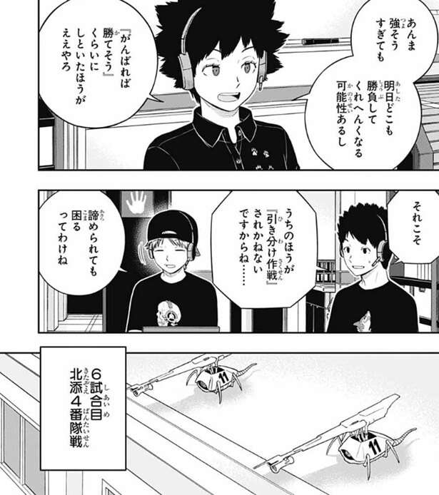 辛くも引き分けに持ち込め、若村隊は無敗をキープ、チームの雰囲気もいい感じです。成績は3勝0敗3引き分けで若村も手応えを感じていて、今日は勝てる……!本当に勝てるぞ……!と、心の中でつぶやきます。そして、7試合目は諏訪7番隊が相手です。絶好調の若村隊ですが、次の相手は前回三輪が勝つと予想していた諏訪隊です。諏訪隊の今の成績がどのくらいなのかも気になりますが、若村隊と諏訪隊どちらが勝つか、注目です。