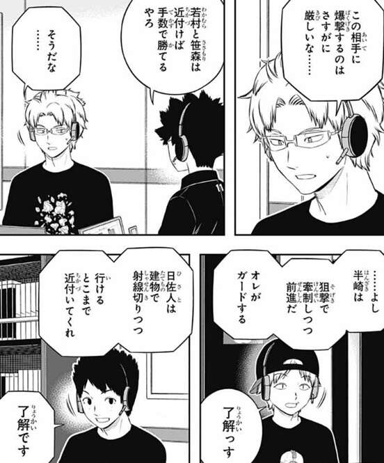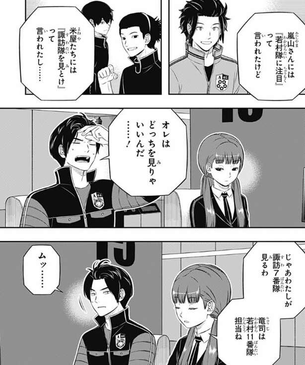 そこに草壁隊の宇野隼人が現れ、宇野は無言で喜多川にカロリーメイトのような物を与えます。それを食べた喜多川はすぐに復活、起き上がります。加古隊は宇野にお礼を言うと、宇野は無言で去っていきます。そして場面はモニタールームに移り、草壁隊の佐伯竜司がどっちのチームを見ればいいかで悩んでいます。嵐山は若村隊に注目、と言っていたようですが、米屋達は諏訪隊を見とけ、と言っていたようで、若村11番隊と諏訪7番隊のどっちを見るかで悩んでいます。すると、草壁隊の隊長・草壁早紀が佐伯に若村11番隊を見るように命令、草壁自身は諏訪7番隊を見るという事で佐伯の悩みは解決します。