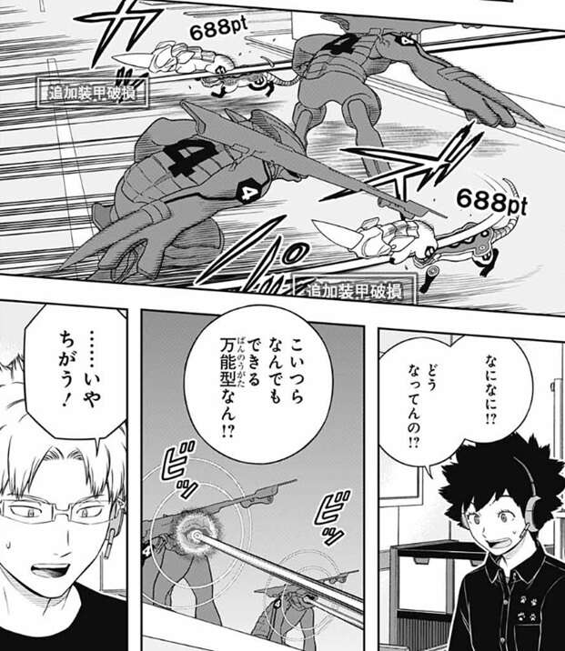 そして、3試合目の相手は二宮8番隊ですが、見た目からしてヤバそうなユニットが3体もいます。笹森はこの3体が雨取の高トリオンで作った高性能ユニットでは、と推測します。