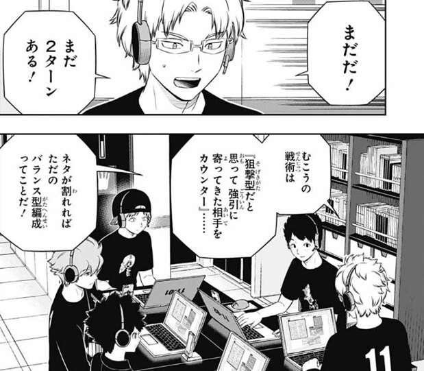 差がついてしまい今までの若村なら意気消沈しそうですが、今回の若村は諦めずまだ2ターンあると、チームメンバーを鼓舞します。向こうの戦術は『狙撃型だと思って強引に寄ってきた相手をカウンター』……、ネタが割れればただのバランス型編成、と若村は説明します。バランス型編成ならヒュースの飛行型がめっぽう強く、爆撃で有利が取れるので、ここからでも引き分けは狙えるぞ!と、若村はチームメンバーに諦めないように指示します。そして、爆撃が決まり点差は縮まっていきます。