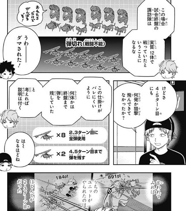 ヒュースの考えは細井と同じく、10体いた狙撃型のコストが大きく抑えられていたと予想します。しかし、半崎と笹森はコストを削ってあの性能は無理がある、諏訪隊の狙撃型は威力も射程もまあまあ高かった、と反論します。するとヒュースは、射程が長い武器には『弾数』のパラメータがあると指摘します。