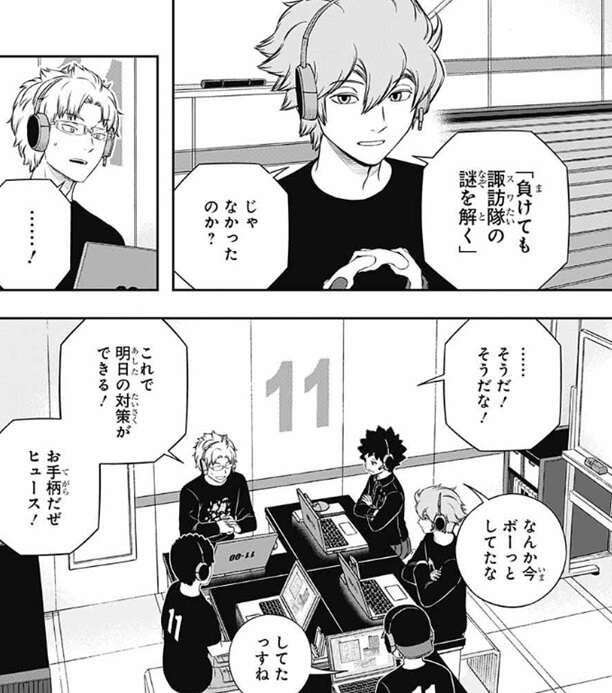 半崎は三雲がこの作戦をマジで考えてんの?とヒュースに聞き、ヒュースがこの推測が当たっていればの話だがなと答えると、これを初日に思いついて形にしてんのがすげえわ、と三雲に驚きます。そこが修の強みといえなくもない、とヒュースが答えると、B級2位は伊達じゃないってことだな……、と笹森も三雲の発想力に驚きます。