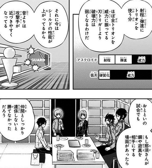 前回のB級ランク戦では鈴鳴第一と那須隊との激闘をなんとか制するも、三雲は自らの実力不足を痛感し、「射撃戦の専門家」の元に自分一人でも点を獲れる方法を聞きに行きます。まずは嵐山隊に話しを聞きに行きますが、嵐山隊の嵐山は射手・銃手では一人で点を獲るのは難しいと言い、仲間と連携する方を勧めます。