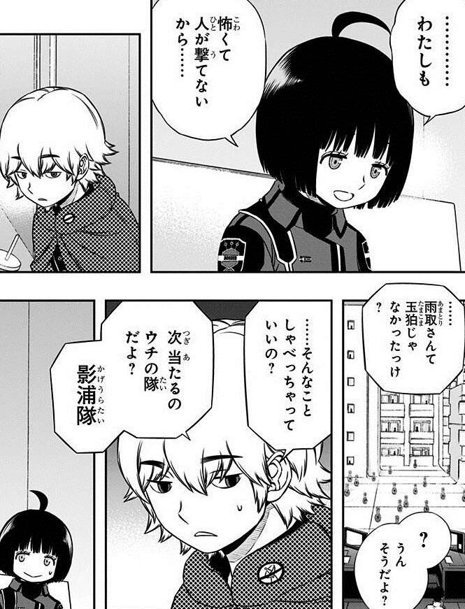 雨取と夏目が「通常狙撃訓練」を行っていると、次にB級ランク戦であたら影浦隊の絵馬ユズルと知り合います。絵馬から、師匠は鳩原だと聞き鳩原も人が撃てずに結局、上層部から遠征部隊に合格していたのに、それが原因で合格を取り消された事を聞きます。雨取は自分と同じ鳩原に共感しますが、絵馬に自分が人を撃てない事まで言ってしまいます。