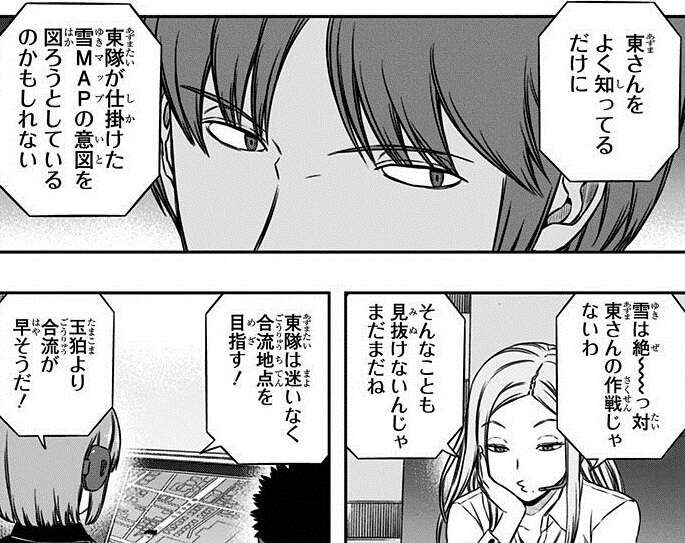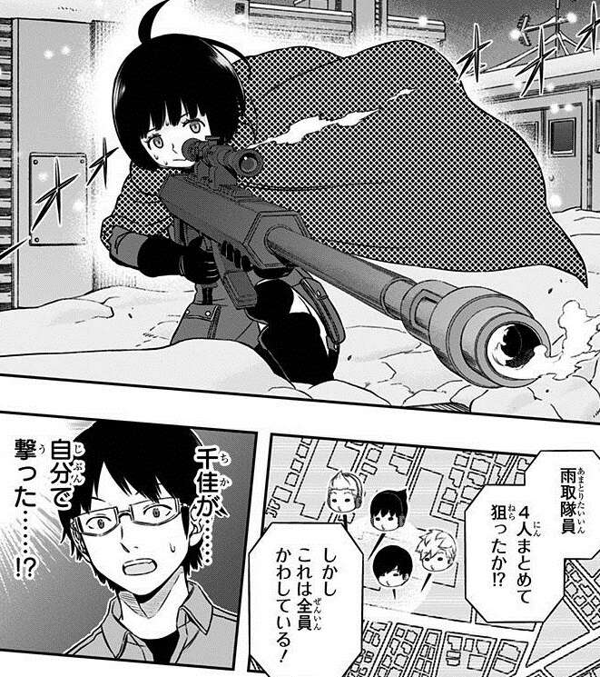一方、三雲が落ちた事で二宮隊、東隊の4人が固まっている状況が出来、ここで雨取が砲撃を撃てば大量得点のチャンスですが雨取は人を撃てないので、三雲は指示を出せずにいます。しかし雨取は自分の意志で4人が固まっている場所を撃ちます。